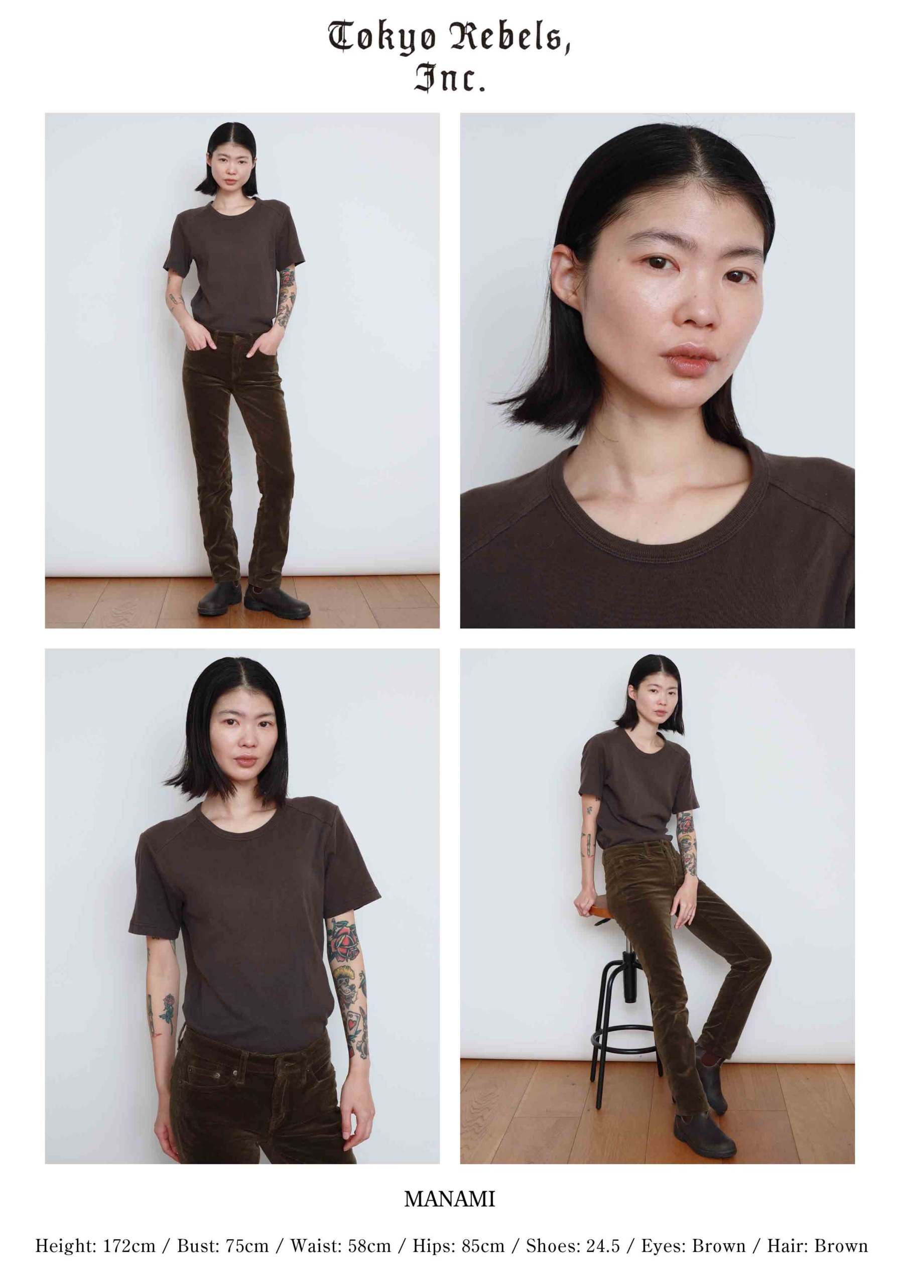 height : 172 / bust : 75 / waist : 58 / hips : 85 /shoes : 24.5 / eyes : Brown / hair : Dk Brown