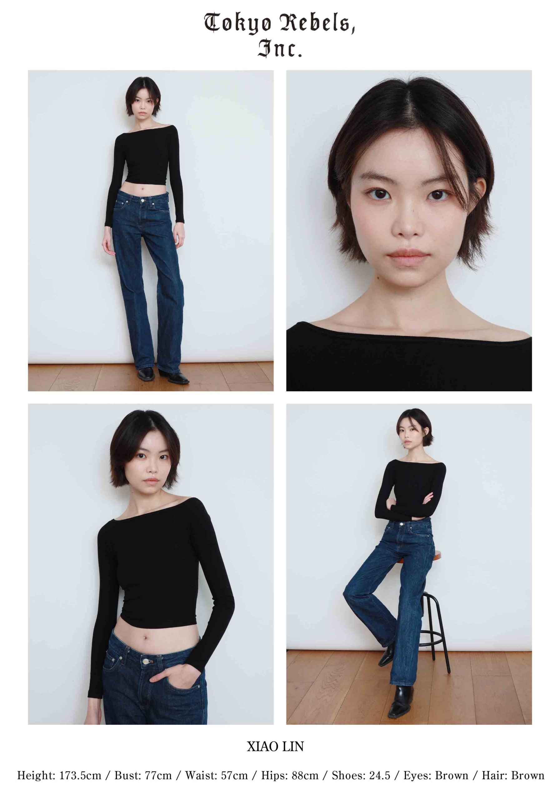 height : 173.5 / bust : 77 / waist : 57 / hips : 88 /shoes : 24.5 / eyes : Brown / hair : Brown