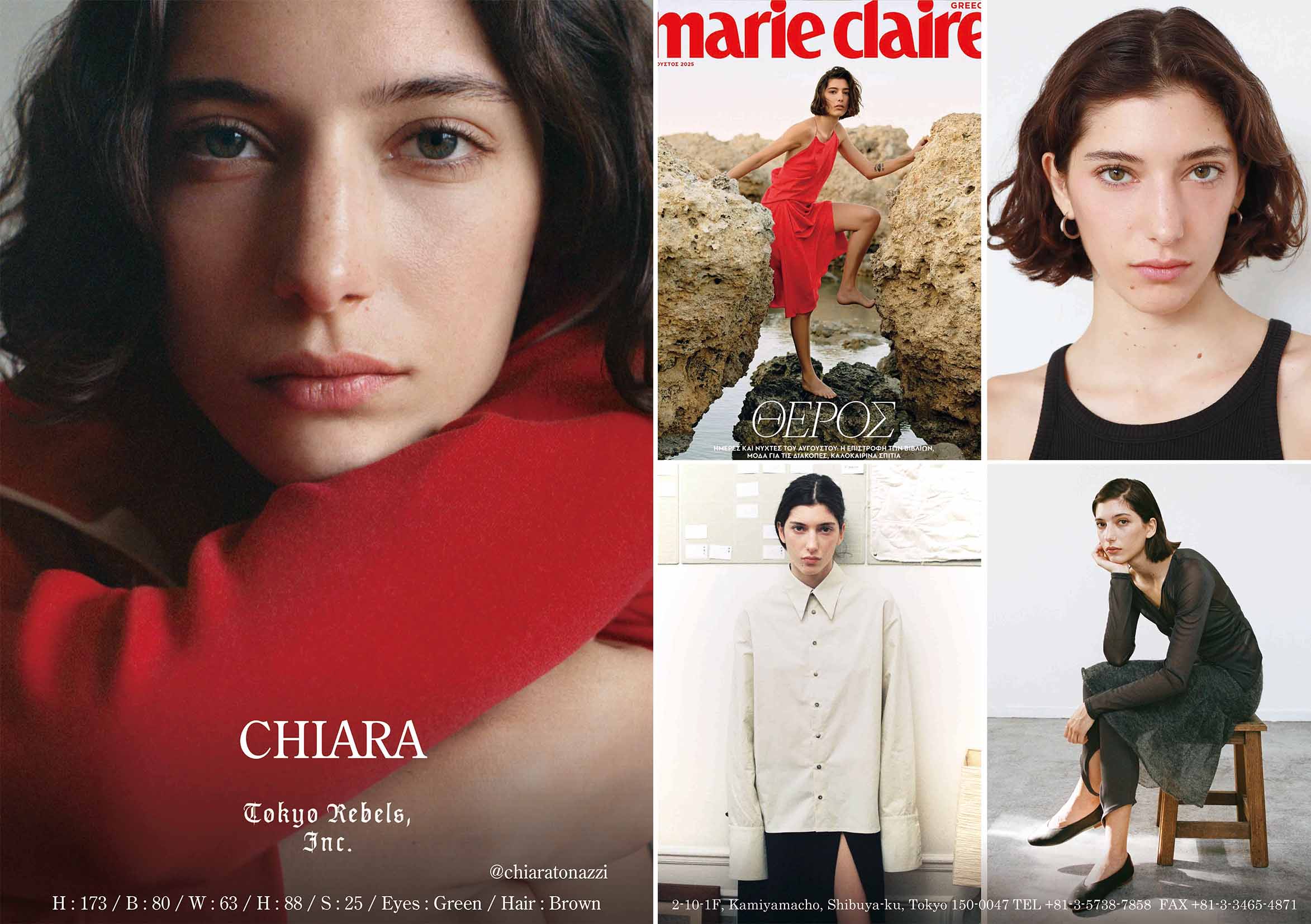 height : 173 / bust : 80 / waist : 63 / hips : 88 /shoes : 25 / eyes : Green / hair : Brown
